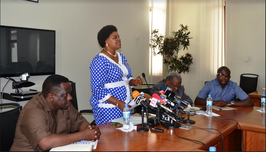 Waziri wa Nchi Ofisi ya Waziri Mkuu (Sera, Bunge, Ajira,Vijana na watu wenye ulemavu) Mhe. Jenista Mhagama akisitiza umuhimu wa ushirikiano kati ya serikali na Shirikisho la Vyama vya Wafanyakazi Nchini (TUCTA) wakati alipokutana na shirikisho hilo leo tarehe 7 Januari 2018, jijini Dar es salaam. Kushoto ni Rais wa TUCTA, Tumaini Nyamghokya na kulia kwake ni Waziri wa Nchi Ofisi ya Rais utawala bora, George Mkuchika, Naibu waziri Ofisi ya Waziri Mkuu (Kazi na Ajira), Anthony Mavunde.