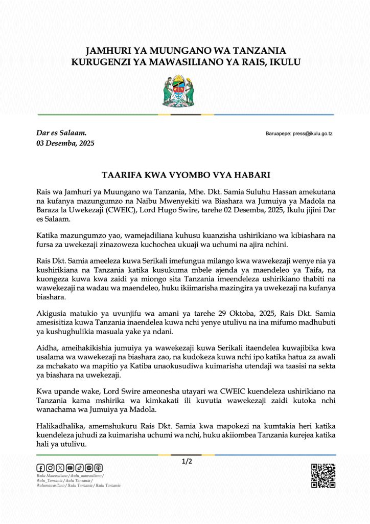 on Serikali yaihakikishia Jumuiya ya Wawekezaji kuwa Tanzania ni nchi tulivu