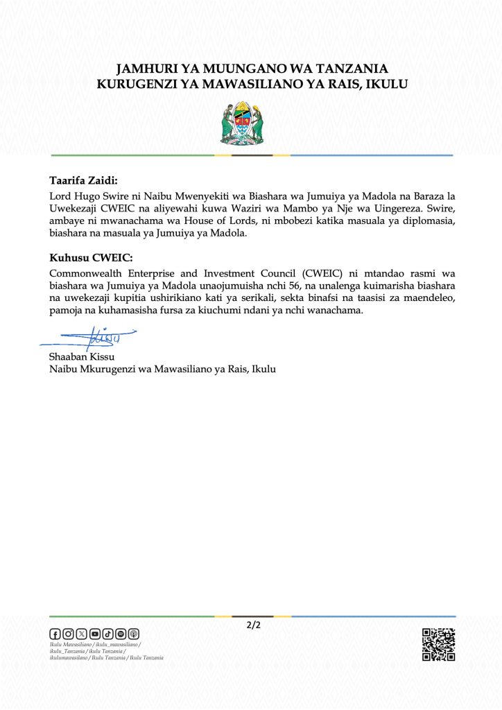 Rais Dkt. Samia akutana na Naibu Mwenyekiti wa Biashara wa Jumuiya ya Madola na Baraza la Uwekezaji Ikulu jijini Dar