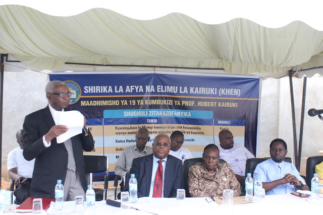 Mkurugenzi wa Hospitali ya Hubert Kairuki, Dkt. Assey Mchomvu akisoma risala ya kumkaribisha mgeni rasmi ili aweze kujionea shughuli mbali mbali zilizokuwa zikiendeshwa na Shirika la Afya na Elimu la Kairuki (KHEN) kwa kipindi chote tokea Febriari 1-6, 2018 katika kuadhimisha Miaka 19 ya Kumbukizi ya Pro. Hubert Kairuki ambaye alifariki Februari 2, 1999. Kutoka kushoto ni Makamu Mkuu wa Chuo Kikuu cha Kumbukumbu ya Hubert Kairuki (HKMU), Professa Charles Mgone, Mama Kokushubira Kairuki ambaye ni mke wa Marehemu Hubert Kairuki pamoja na mgeni rasmi Mganga Mkuu wa Manispaa ya Kinodnoni, Dkt. Festo Dugange.