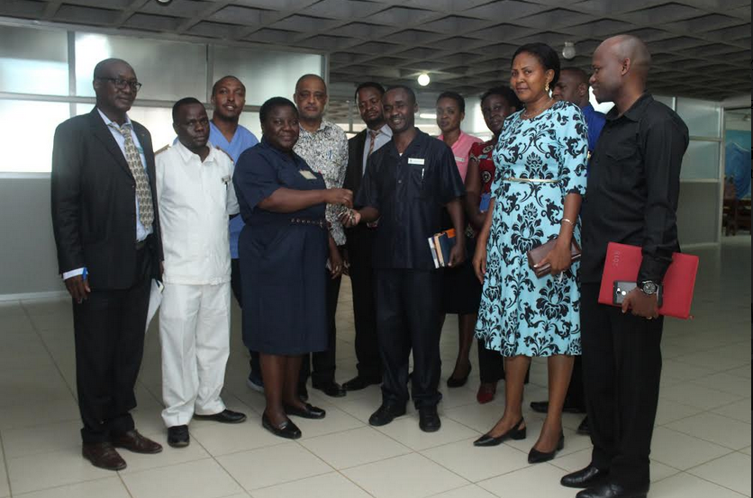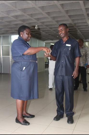 Mkurugenzi wa Idara ya Uuguzi wa Hospitali ya Taifa Muhimbili (MNH) ) Agnes Mtawa akimkabidhi Mkurugenzi wa Idara ya Uuguzi wa Taasisi ya Moyo Jakaya Kikwete (JKCI) Robert Mallya funguzo za baadhi ya wodi zilizopo ndani ya jengo la wodi ya watoto ambazo Hospitali hiyo imezitoa kwa JKCI ili wazitumie kutokana na uhaba wa wodi ya watoto walionao.