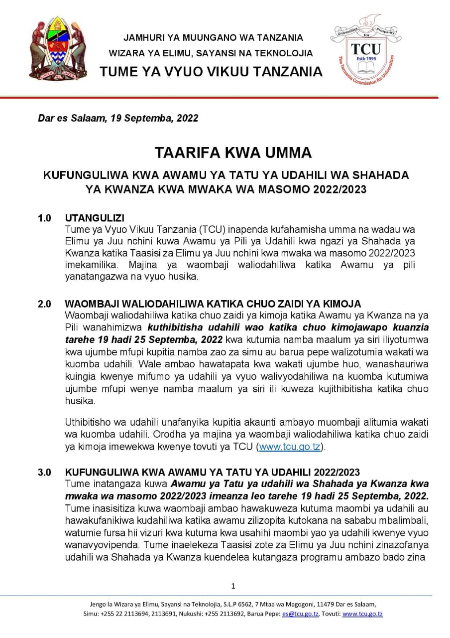 on TCU yakamilisha udahili kwa mwaka wa masomo 2022/2023