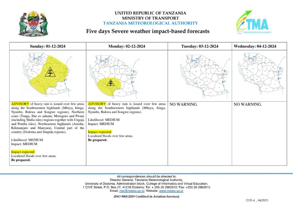 on TMA yatabiri hali ya hewa mbaya kwa siku tano kwa mikoa 11
