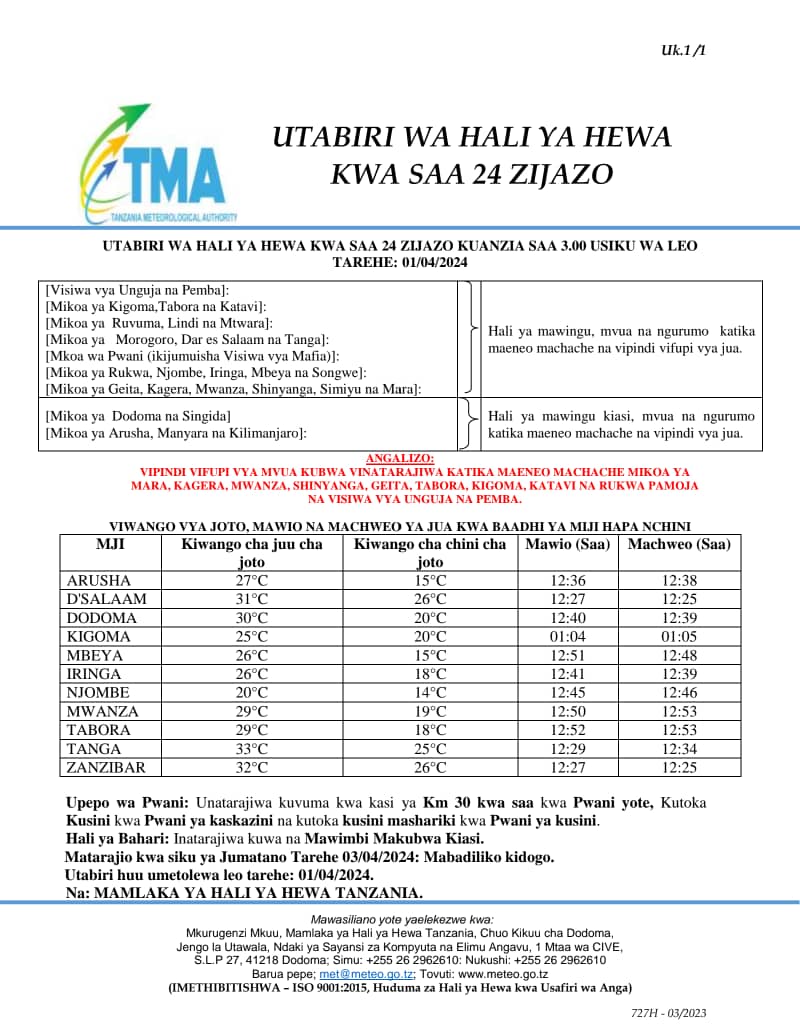 on TMA yatoa matarajio ya hali mbaya ya hewa kwa siku tano