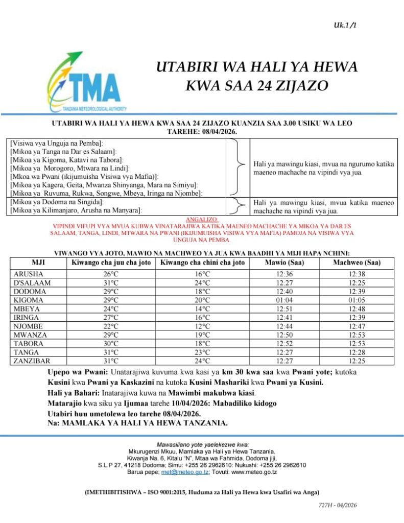 TMA yatoa tahadhari ya hali mbaya ya hewa kwa mikoa mitano