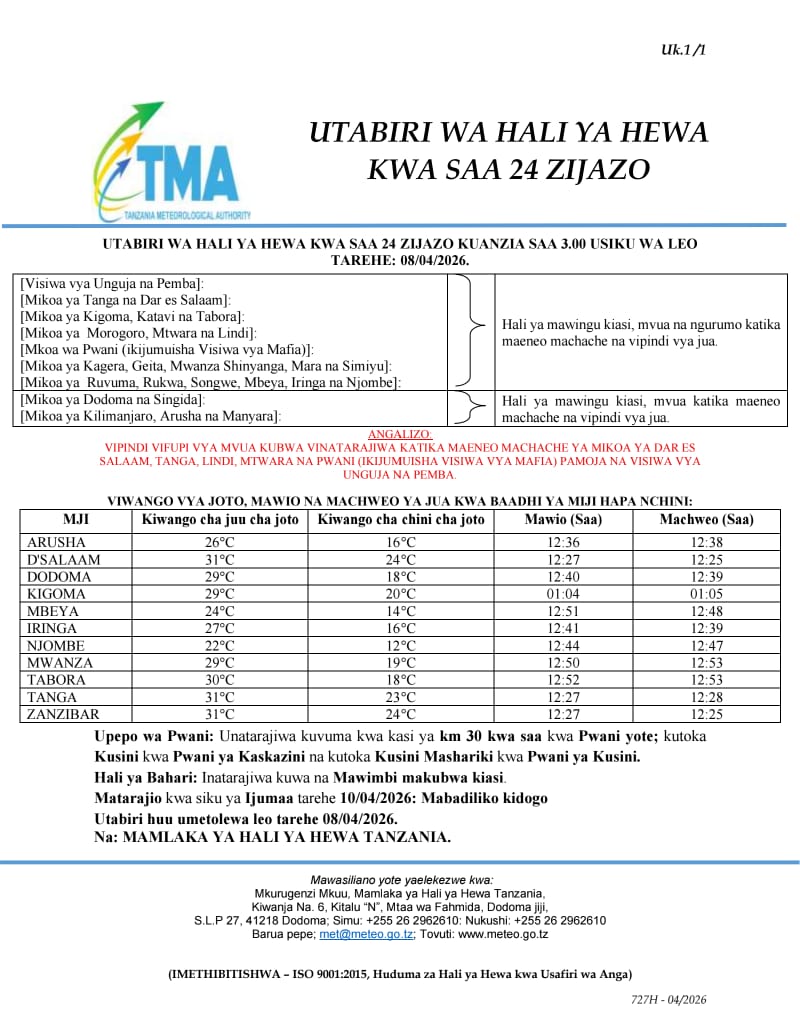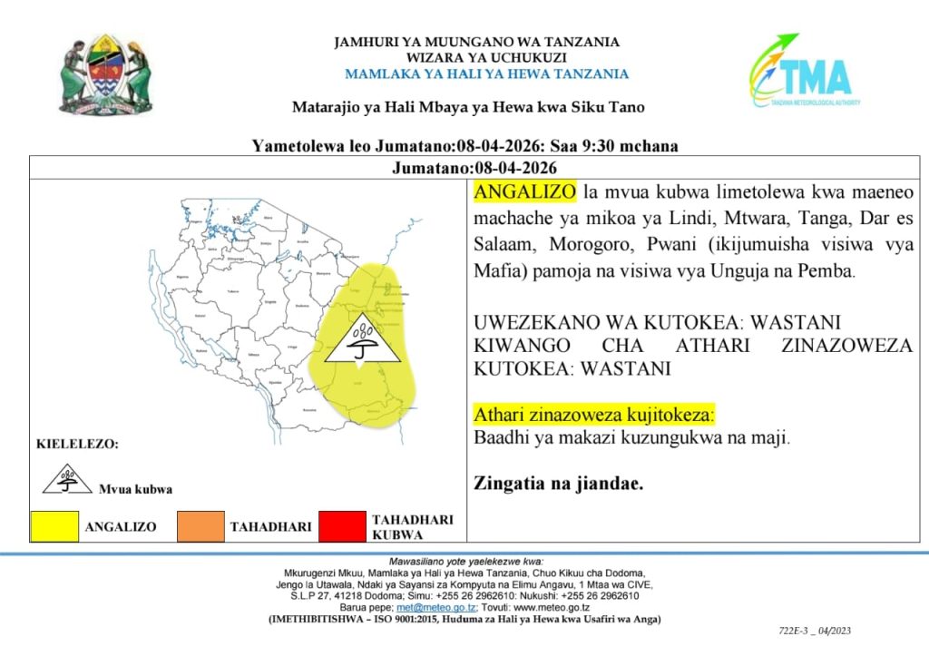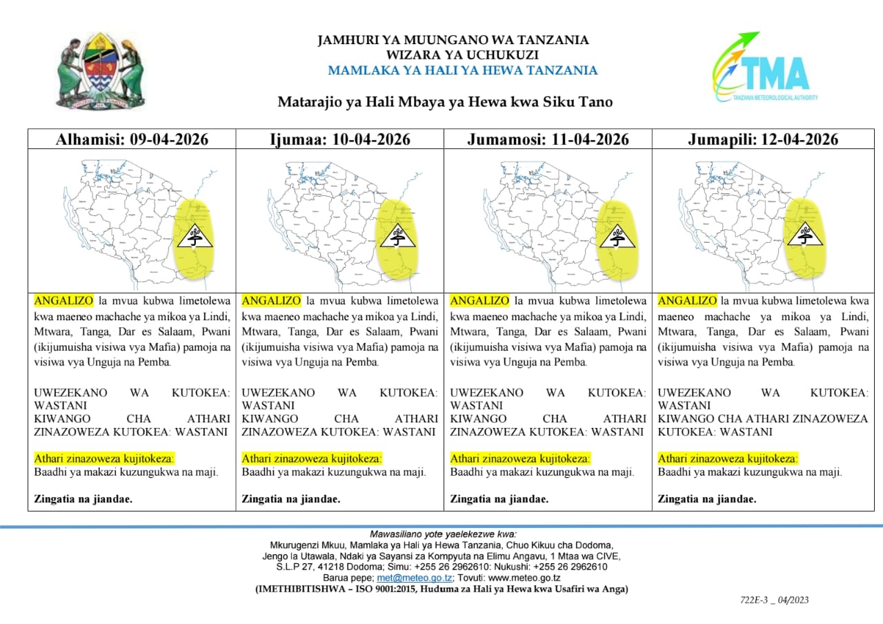 on TMA yatoa tahadhari ya hali mbaya ya hewa kwa mikoa mitano