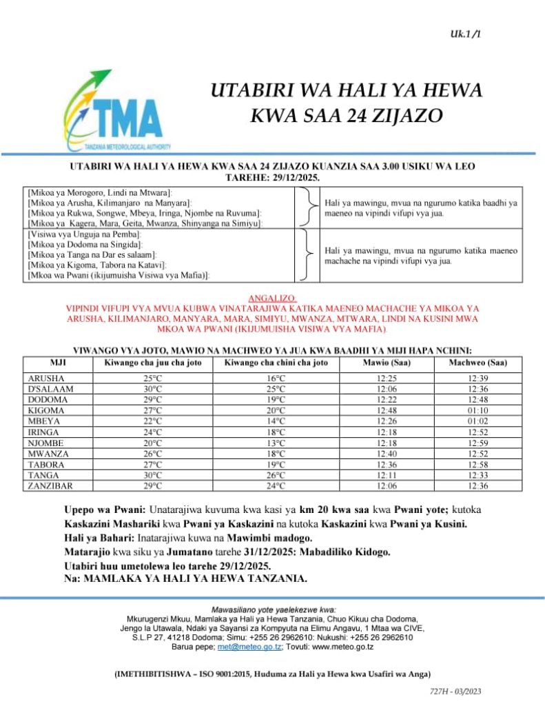 Aidha Mamlaka ya Hali ya Hewa Tanzania TMA imesema Visiwa vya Unguja na Pemba ,Mikoa ya Dodoma na Singida ,Tanga na Dar es Salaam,Kigoma ,Tabora na Katavi,mikoa ya Pwani,ikijumuisha Visiwa vya Mafia, itakuwa na hali ya mawingu mvua ngurumo katika maeneo machache na vipindi vifupi vya jua.