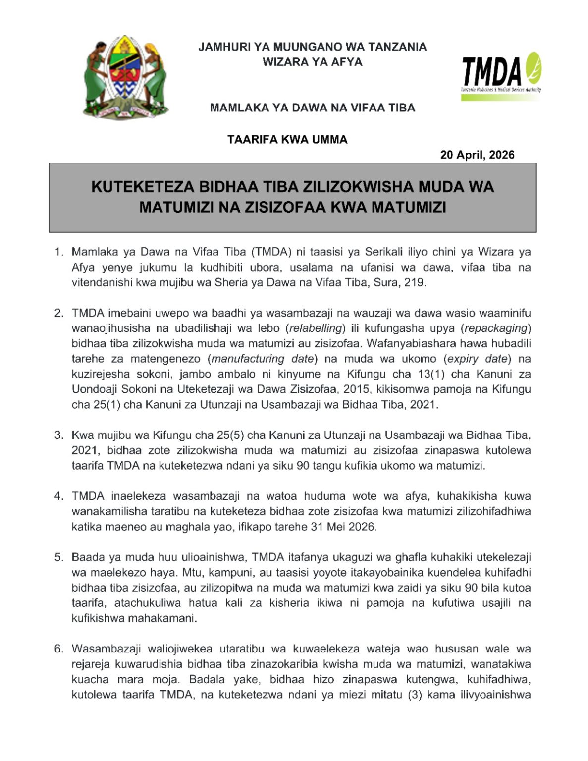 on TMDA kuteketeza bidhaa tiba zilizokwisha muda wa matumizi na zisizpfaa kwa matumizi