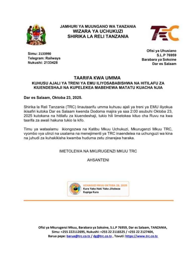 on TRC yafanya uchunguzi wa kina ajali ya treni ya mwendokasi Ruvu