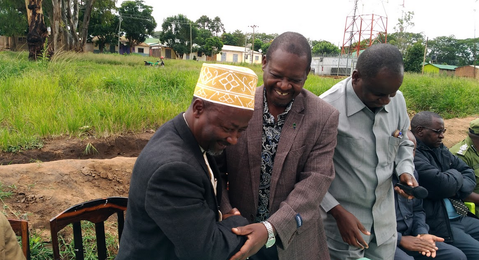 Mkuu wa Mkoa wa Rukwa Mh. JoachimWangabo (kulia) akiepeana Mikon o na Shekhe Mkuu wa Mkoa wa RukwaRashid Akilimali baada ya maridhiano ya ujenzi wa Msikiti.