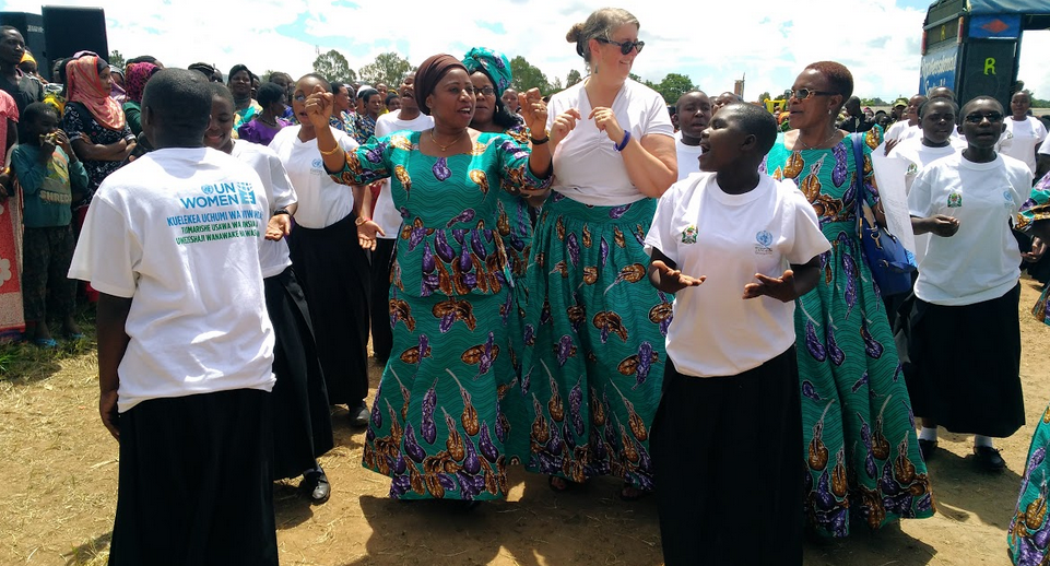 Waziri wa Afya Mh. Ummy Mwalimu (mwenyekitenge kushoto) akiserebuka na wanafunzi wa shule ya sekondari Kizwite katika maadhimisho ya siku ya wanawake Duniani yaliyofanyika Kimkoa katika manispaa ya Sumbawanga, (kushoto kwake) Mwakilishi wa Balozi wa Canada Bi. Susan Steffen pamoja na wanafuinzi.