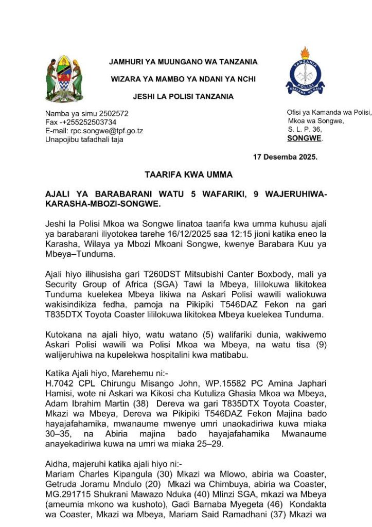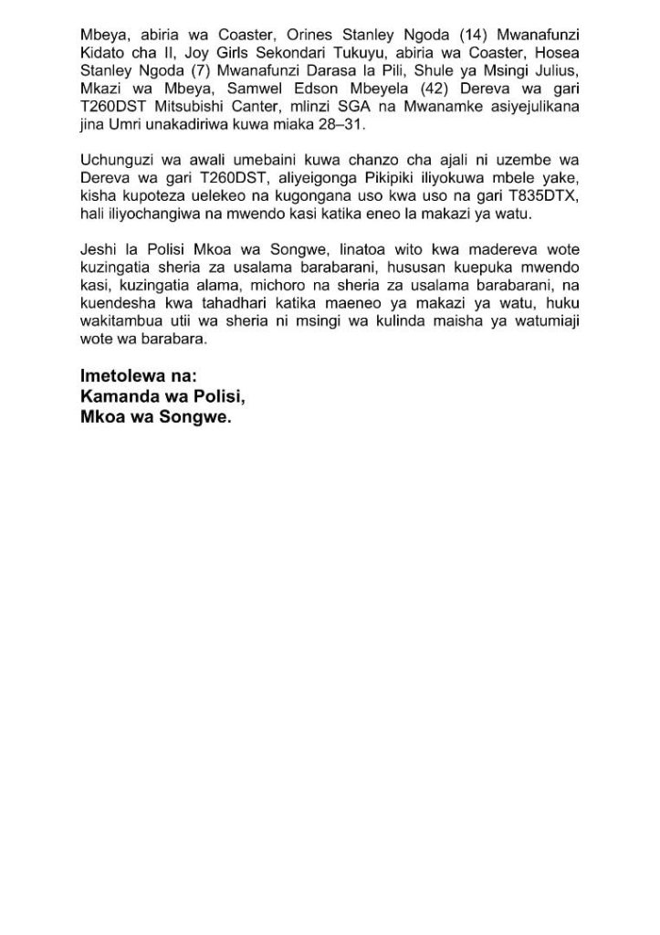 on Watano wafariki, 9 wajeruhiwa Songwe