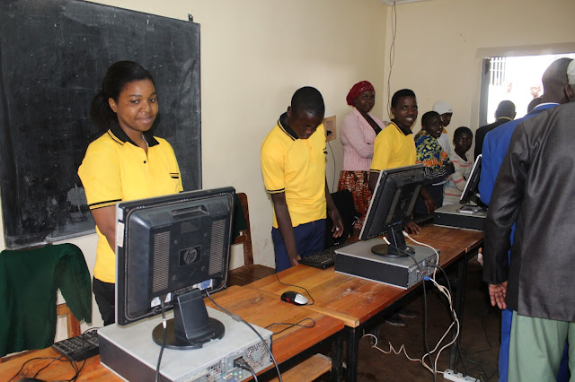 Katibu wa mbunge wa jimbo la mufindi kaskazini Baptist Mdende ambaye alikuwa mgeni rasmi kwenye maonyesho hayo akipata maelezo kutoka chumba cha kompyuta ambacho nacho kipo chuoni hapo