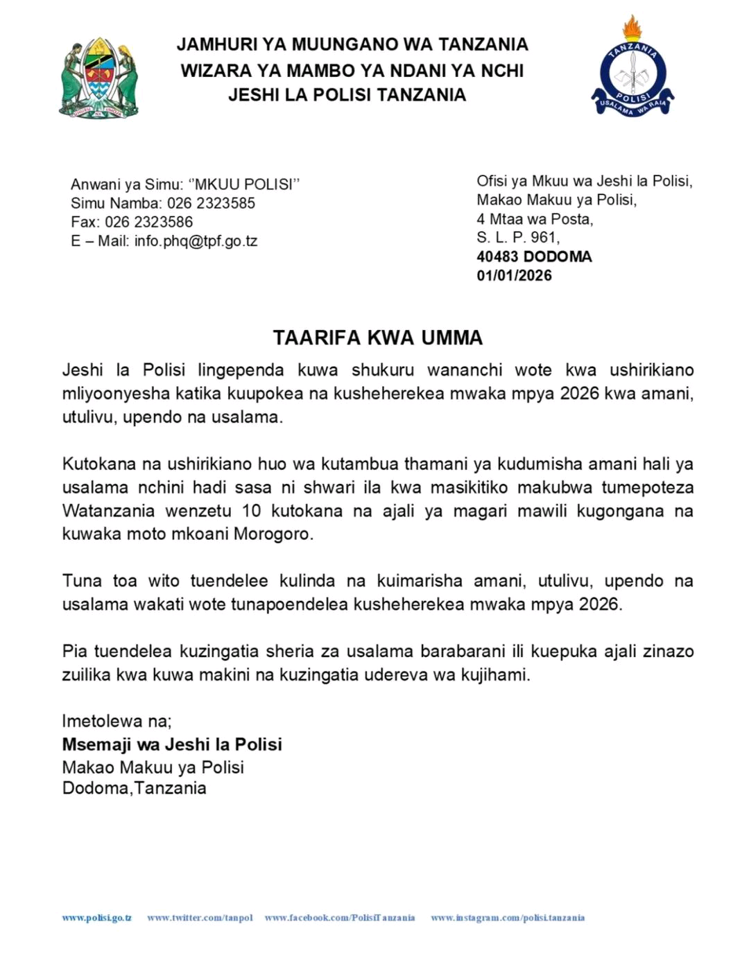 Jeshi la Polisi laimarisha ulinzi sherehe za Mwaka Mpya