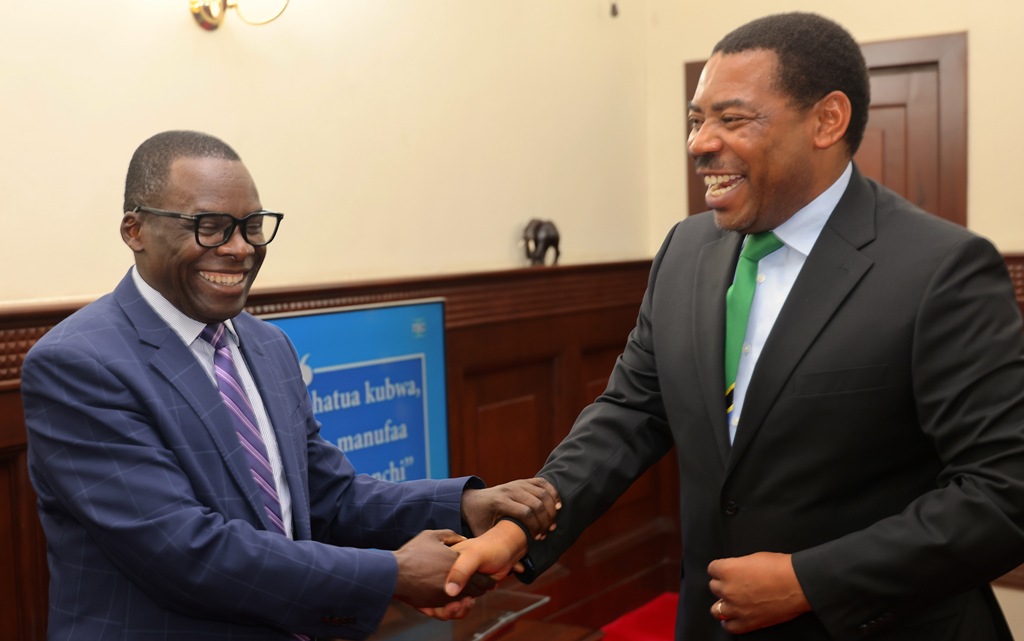 Waziri Mkuu, Dkt. Mwigulu Nchemba akisalimiana na Katibu Mkuu Kiongozi, Balozi Dkt. Moses Kusiluka kwenye Ofisi Ndogo ya Waziri Mkuu, Magogoni jijini Dar es salam, Januari 9, 2026. (Picha na Ofisi ya Waziri Mkuu)