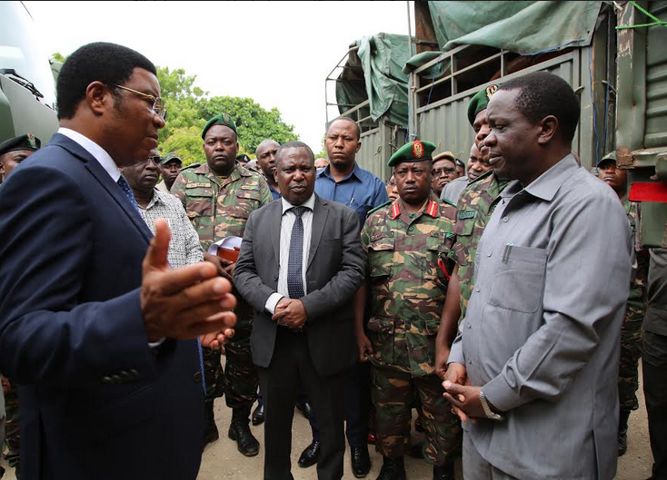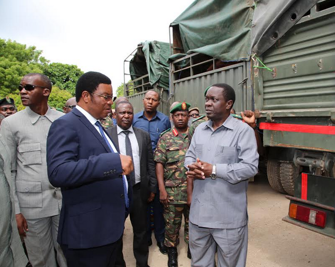Waziri Mkuu Kassim Majaliwa. kushoto akiongea na Waziri wa Viwanda na Biashara (kulia).Bwana Charles Mwijage na Waziri wa Kilimo (katikati) Dkt. Charles Tizeba pamoja na Maofisa wa JWTZ wakati alipo tembelea Kikosi cha 95KJ kinacho Safirisha Mbolea kwenda Mikoani