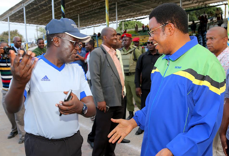 Waziri Mkuu, Kassim Majaliwa akizungumza na Spika wa Bunge la Afrika ya Mashariki, Mhe.Martin Ngoga katika mchezo wa mpira wa miguu kati ya Wabunge wa Jamhuri ya Muungano wa Tanzania na Wabunge wa Bunge la Afrika Mashariki kwenye uwanja wa Jamhuri jijini Dodoma Aprili 26, 2018.(Picha na Ofisi ya Waziri Mkuu)
