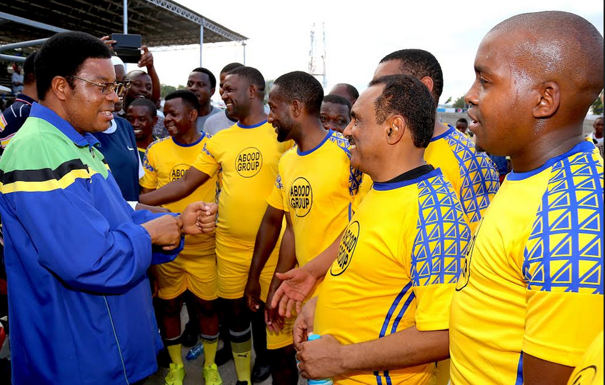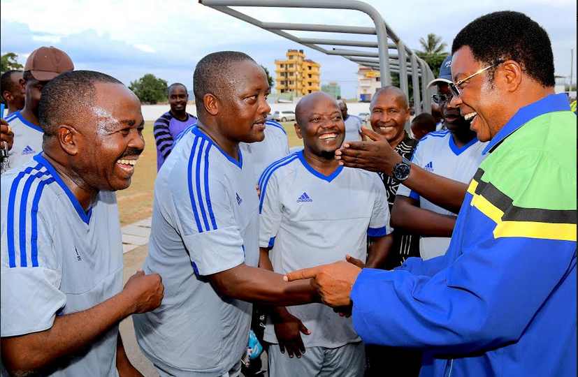 Waziri Mkuu, Kassim Majaliwa akifurahi jambo na Wabunge la Afrika ya Mashariki, wakati alipohudhuria kushuhudia mchezo wa mpira wa miguu kati ya Wabunge wa Jamhuri ya Muungano wa Tanzania na Wabunge wa Bunge la Afrika Mashariki Aprili kwenye uwanja wa Jamhuri jijini Dodoma 26, 2018.(Picha na Ofisi ya Waziri Mkuu)