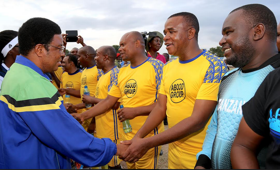 Waziri Mkuu, Kassim Majaliwa akisalimiana na Mbunge wa Sengerema, William Ngeleja katika mchezo wa mpira wa miguu kati ya Wabunge wa Jamhuri ya Muungano wa Tanzania na Wabunge wa Bunge la Afrika Mashariki kwenye uwanja wa Jamhuri jijini Dodoma Aprili 26, 2018, kutoka kushoto ni Mbunge wa Morogoro Mjini Aziz Abood,Mbunge wa Arumeru Mashariki Joshua Nassari,Mbunge wa Mafinga Cosato Chumi,Mbunge wa Mbulu Vijijini Flatei Massayna Mbunge wa Mchinga Hamidu Bobali.(Picha na Ofisi ya Waziri Mkuu)