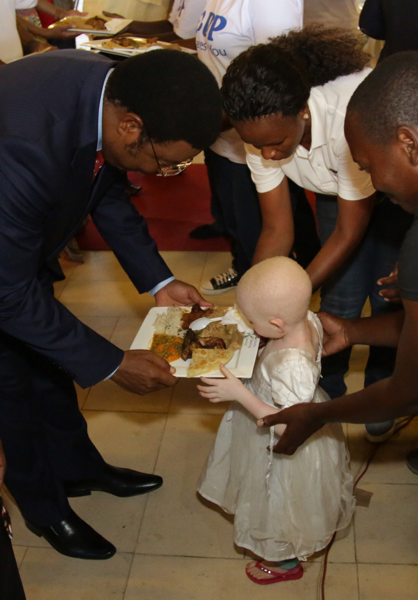 Waziri Mkuu, Kassim Majaliwa akimpatia chakula mtoto Mwahija Hassan, katika hafla ya chakula cha mchana kwa ajili ya watu wenye ulemavu, iliyofanyika kwenye ukumbi wa Diamond Jubilee. Februari 4, 2018.