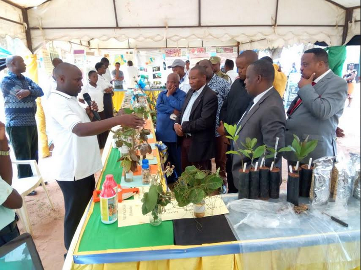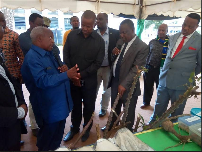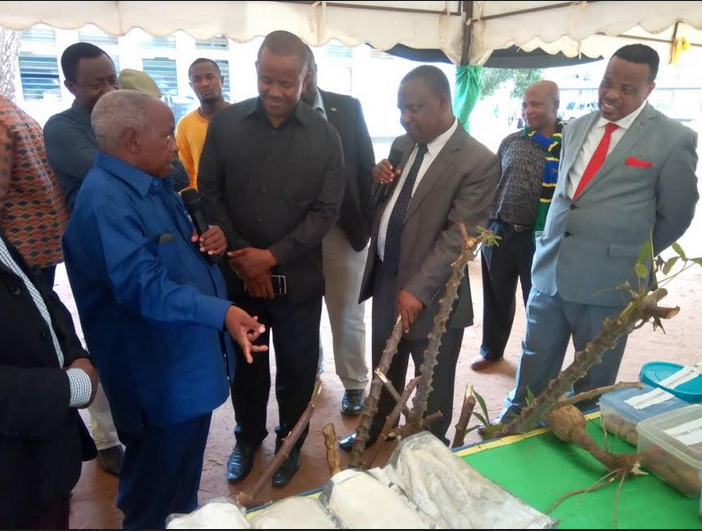Kaim Mkurugenzi wa Taasisi yaUtafiti wa Kilimo NALIENDELE Iliyopo Mkoani Mtwara Dkt Omar Mponda akitoa maelezo kwa Waziri wa Kilimo Dkt.Charles Tizeba kuhusiana na Mbegu za Muhogo ambazo zinazalishwa na Taasisi ya Hiyo.