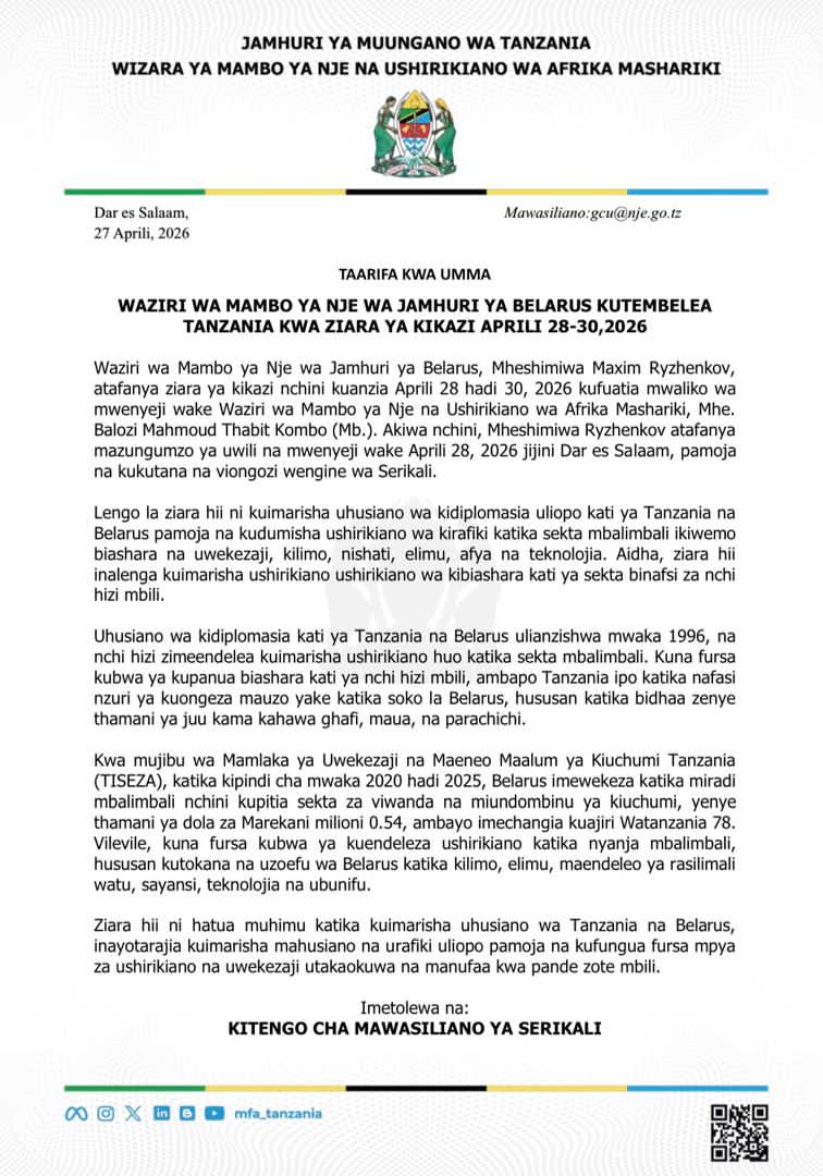 Waziri wa Mambo ya Nje wa Belarus kutembelea nchini