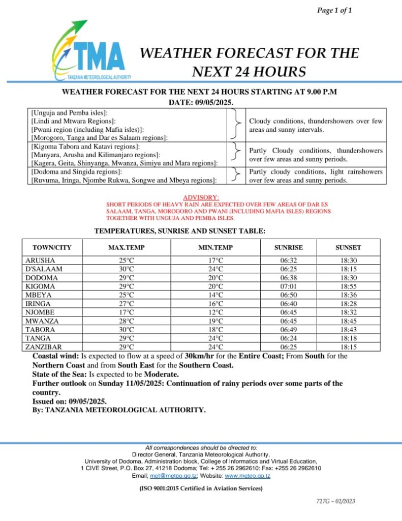 TMA yatoa tahadhari ya matarajio ya hali ya hewa mbaya kwa siku tano